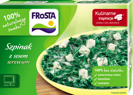 Marka FRoSTA oferuje konsumentom mrożony Szpinak w pięciu wariantach do wyboru: w liściach, poszatkowany, z sosem serowym, z sosem śmietanowym oraz porcjowany z sosem śmietanowym. Produkty stanowią nie tylko źródło cennych wartości odżywczych, ale i inspirującą bazę kulinarnych pomysłów, dzięki której można przyrządzić wiele smacznych potraw.