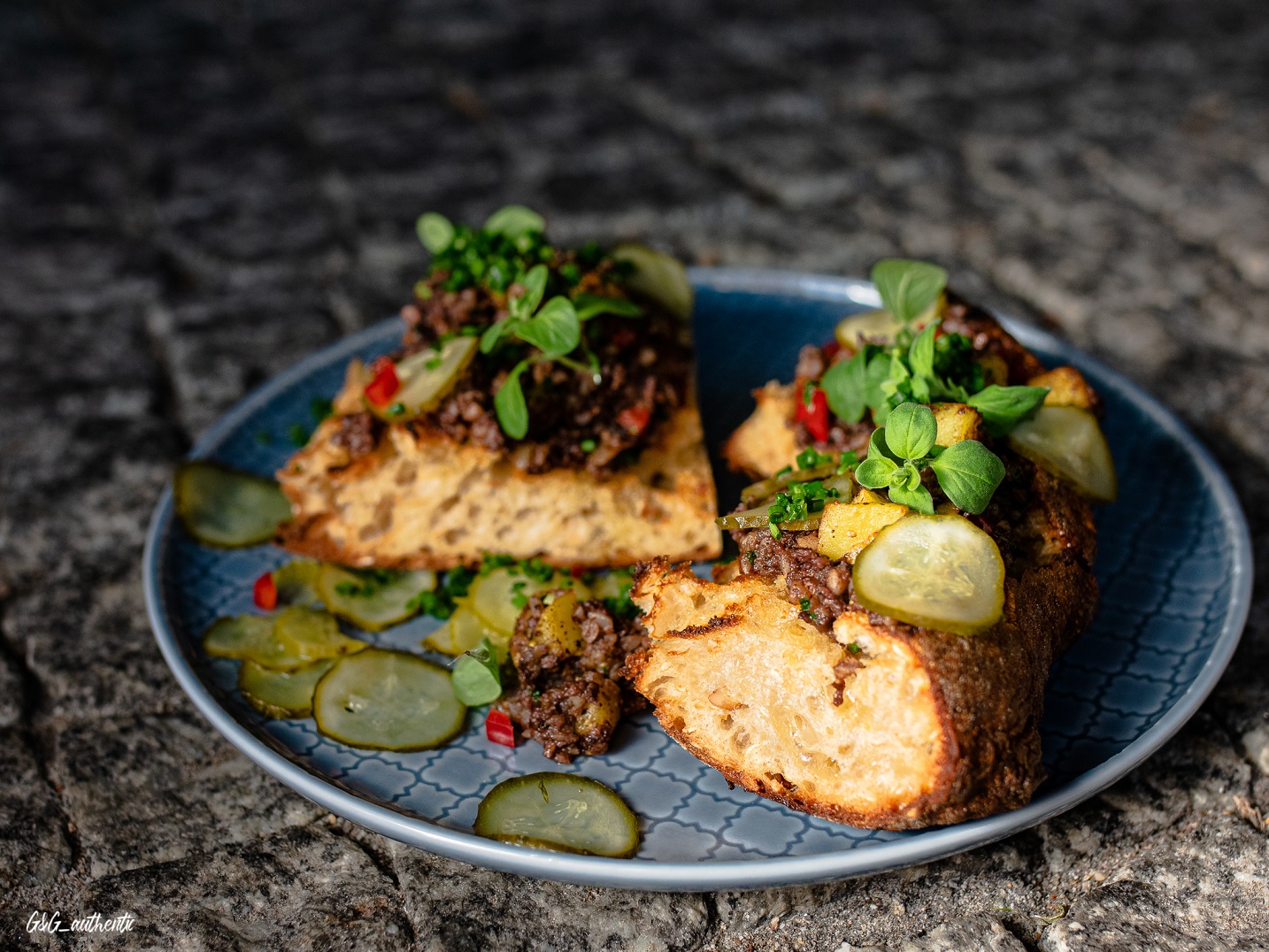 Sposób przygotowania: obrane ziemniaki kroimy w drobną kostkę i przesmażamy na patelni na złoty kolor. Wsypujemy pokrojoną paprykę. Kiedy warzywa będą półtwarde, dorzucamy do nich kaszankę, doprawiamy solą, pieprzem, dodajemy musztardę i na koniec natkę pietruszki oraz majeranek. Pajdy chleba wysmażamy na chrupiąco na patelni, wykładamy solidne porcje zapiekanki ziemniaczanej, na wierzch kładziemy plastry ogórka kiszonego i szczypiorek.